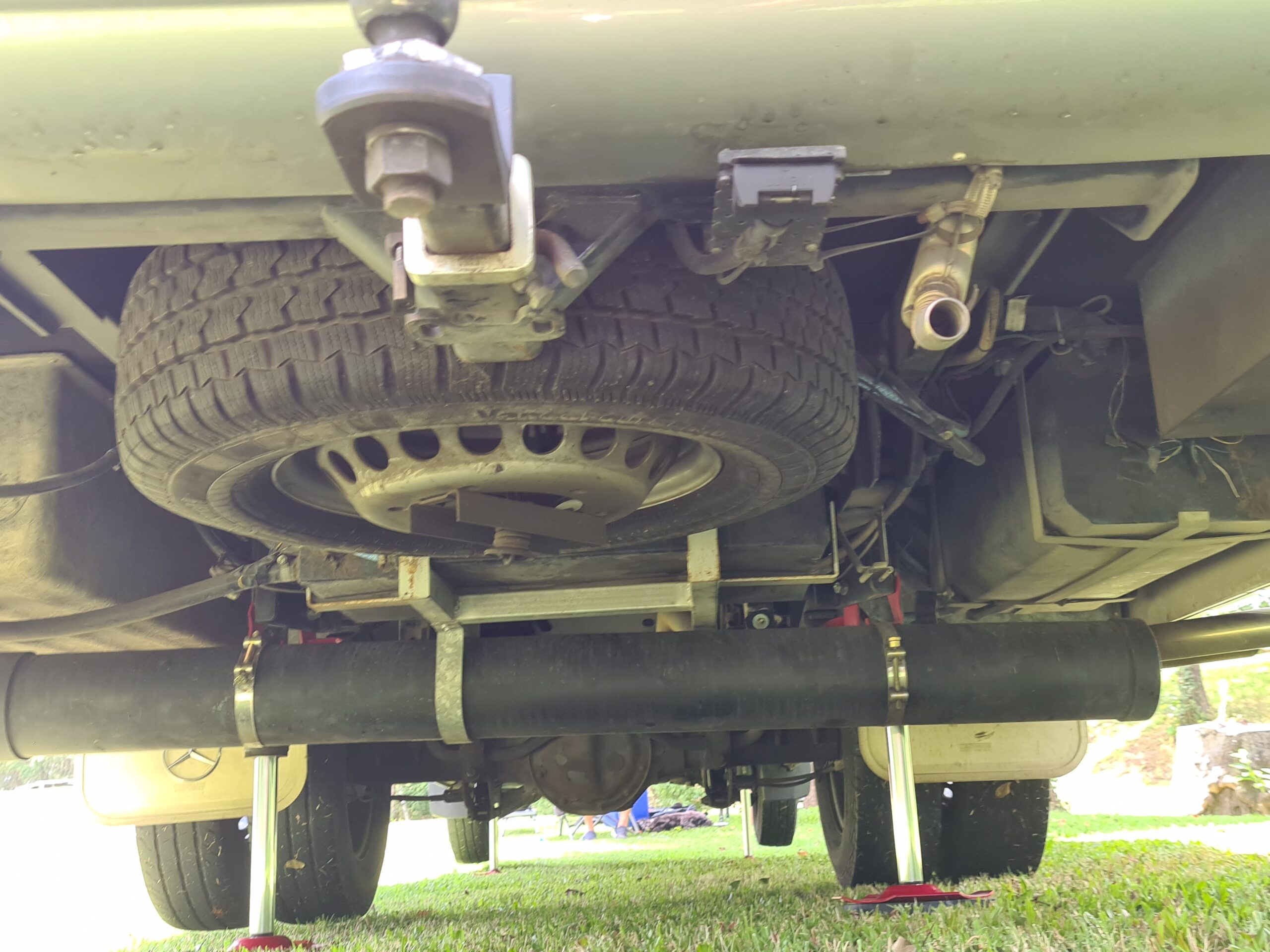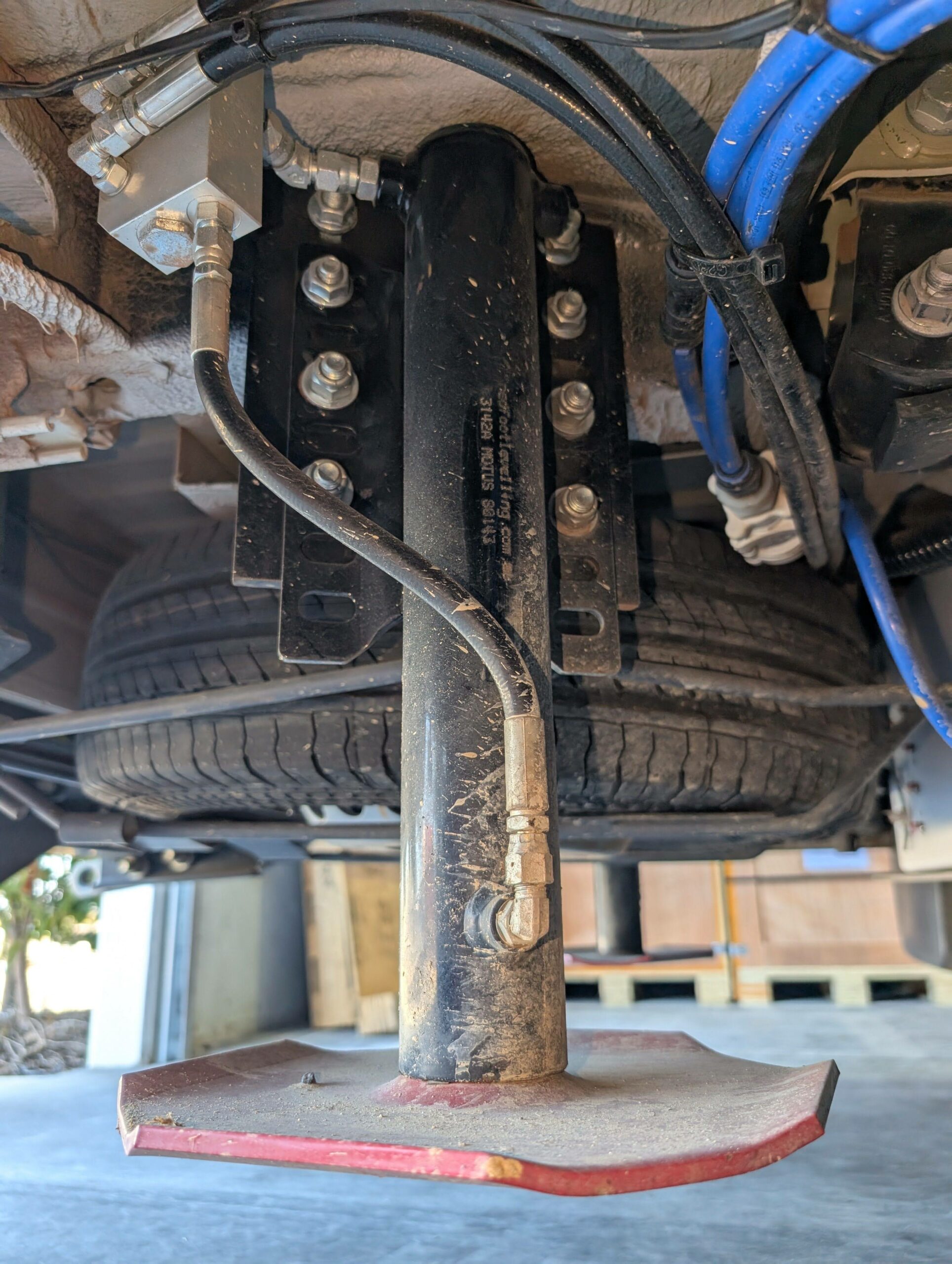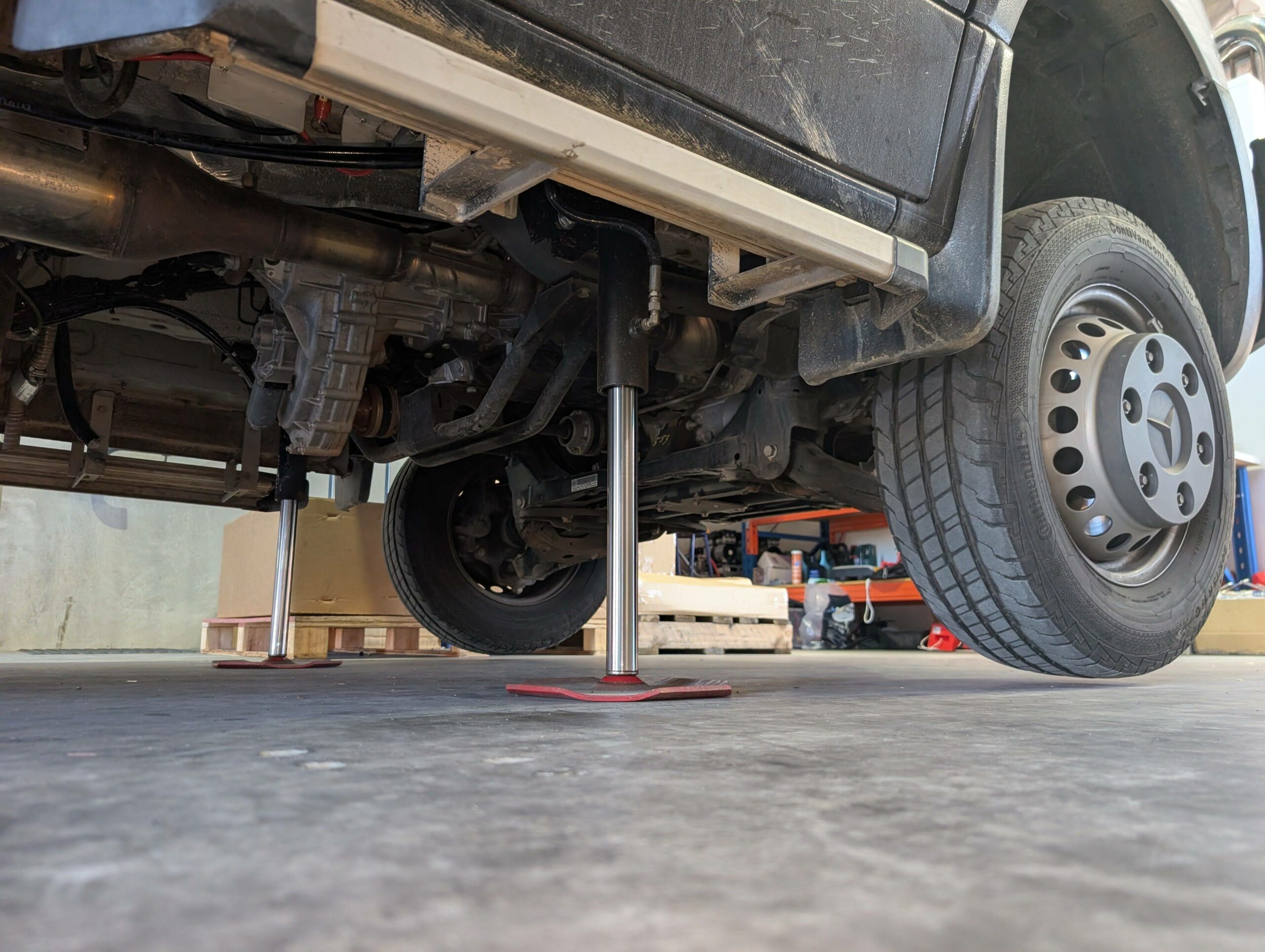 3. Four custom-designed hydraulic cylinders that match the wedge shape of the Sprinter Chassis where the front sits lower to the ground than the rear